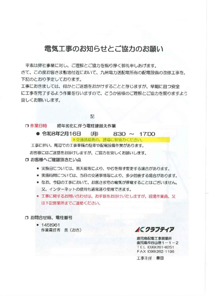 2026年2月16日(月)の8:30~17:00に電柱の老朽化に伴う工事を行うということで連絡があり、弊社へ入庫や出庫される際、海側から入庫していただき海側へ出庫していただくこととなりますのでお知らせ致します。